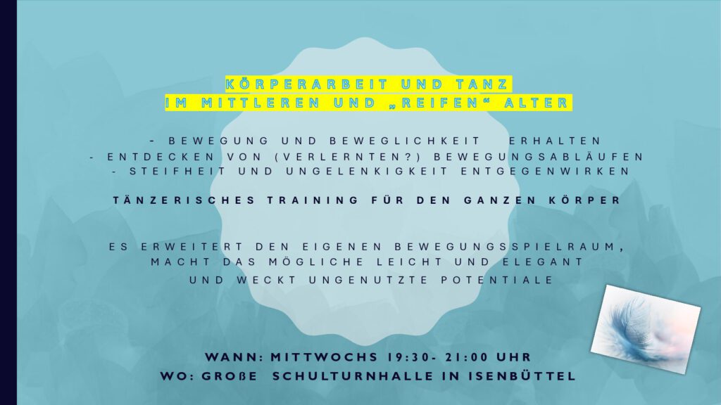 Immer wieder fließen auch einmal Lektionen von Feldenkrais in unsere Trainingszeit ein. Sie machen uns unsere Fehler in der Bewegung deutlich. Durch Übungen mit der Feldenkrais Methode trainieren wir die Achtsamkeit gegenüber unserem Körper. Wir lernen ihn besser kennen und lernen dabei auch mental zu entspannen. Es ist ein Lernen ohne Anstrengung- durch kleine, langsame und achtsame Bewegungen nehmen wir den Körper wieder besser wahr, erkennen ungünstige Bewegungsmuster und lernen günstigere, schmerzfreiere Varianten zu entwickeln. Das unterstützt auch am Ende unsere Beweglichkeit und Tanzfähigkeit.